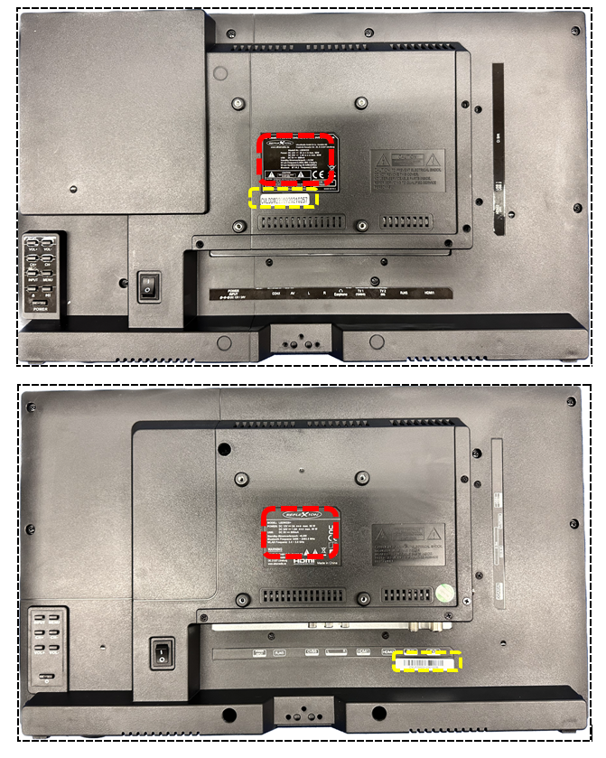 - Auf den Beispielbildern ist die Geräterückseite zu sehen. Die rote Markierung zeigt das Typenschild und gelb Markierung zeigt die Seriennummer an.